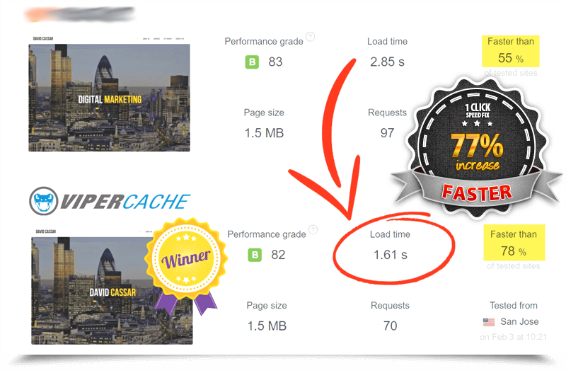The tests here were carried out on real sites with the site owners permission. Typical speed improvements in our tests were 100 - 350%... Up to 1000% speed increase is possible on slower more congested servers.